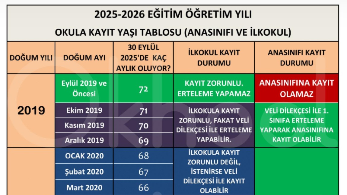 Değerli velilerimiz, 2025 - 2026 Eğitim Öğretim yılı için öğrencinin hangi sınıfa kaydolabileceğini açıklayan tablomuz aşağıda mevcuttur. Öğrencinin doğduğu yıl ve aya göre, 2025 Eylül tarihinde kaç aylık olacağına göre okula kayıt yaşı hesaplanmaktadır.